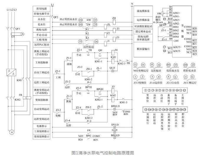 (6)清凈水泵本體擴容改進,配套電動機功率由15kW升至75kW。4設備改進后的電氣控制原理改進后的清凈水泵電氣控制電路實現(xiàn)如下功能:在遠方控制方式下,可從PLC程控畫面工頻起動和變頻起動水泵;在自動操作形式下水處理設備,水泵的起停受水池高、低液位自動控制,水池液位達到高水位定值(3m)時,PLC程控高水位接點閉合自動起動水泵,水池液位降至低水位定值(1.5m)后,程控低水位接點閉合自動停運水泵;在變頻運行模式下,可從水泵就地控制柜和PLC程控畫面調(diào)節(jié)變頻器輸出頻率。