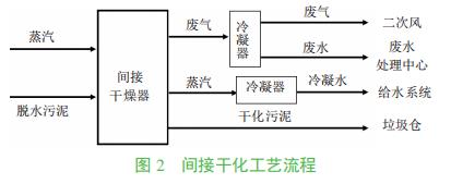 間接加熱式又稱熱傳導干燥技術,工藝流程見圖 2。在干燥過程中,熱介質 (蒸汽、導熱油等)并不直接與污泥接觸,而是通過熱交換器將熱能傳遞給濕污泥,使污泥中的水分蒸發。在整個干化過程中,熱介質與污泥分離,完成傳熱后冷凝回收,進入焚燒廠給水系統;廢氣經冷凝后產生的廢水送入廢水處理中心處理;其余廢氣可作為二次風送入焚燒爐;完成干化的污泥焚燒或填埋。